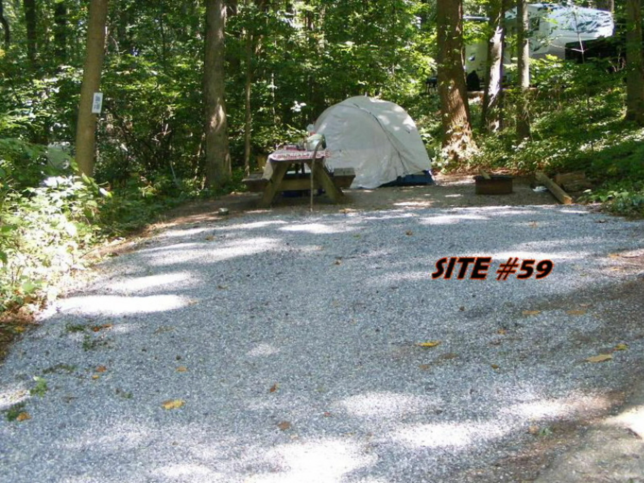 Make your Camping Memories on…Site #59(Water & Electric, Back-in, Tent Campsite)5’ Picnic Table, Swiveling “Hibachi” Charcoal Grill with Adjustable Height Cooking Grate & Standard 22” Campfire Ring